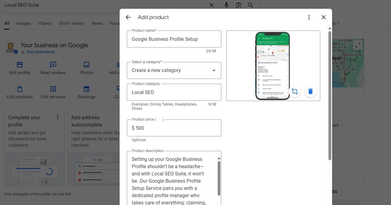 Though this feature is relatively new and doesn’t carry the same SEO weight as traditional website content, at Local SEO Suite, we recommend creating a product listing for every item or service you offer. Additionally, including generic product names alongside branded ones (for example, “Nike Shoes,” “Red Nike Shoes,” and “Red Shoes”) can help capture broader search queries and improve overall reach.