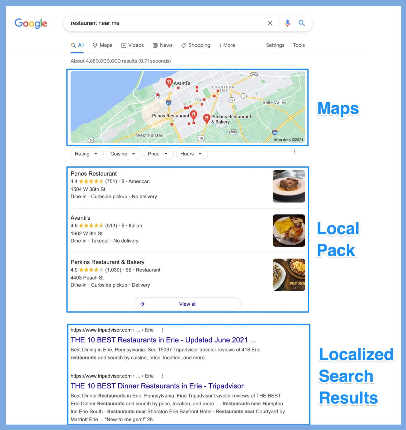 Searches for products and services in your area show local search results pages like the example above. Learning how to optimize Google My Business Profiles is important for appearing highly on Google Maps and in the Local Pack.